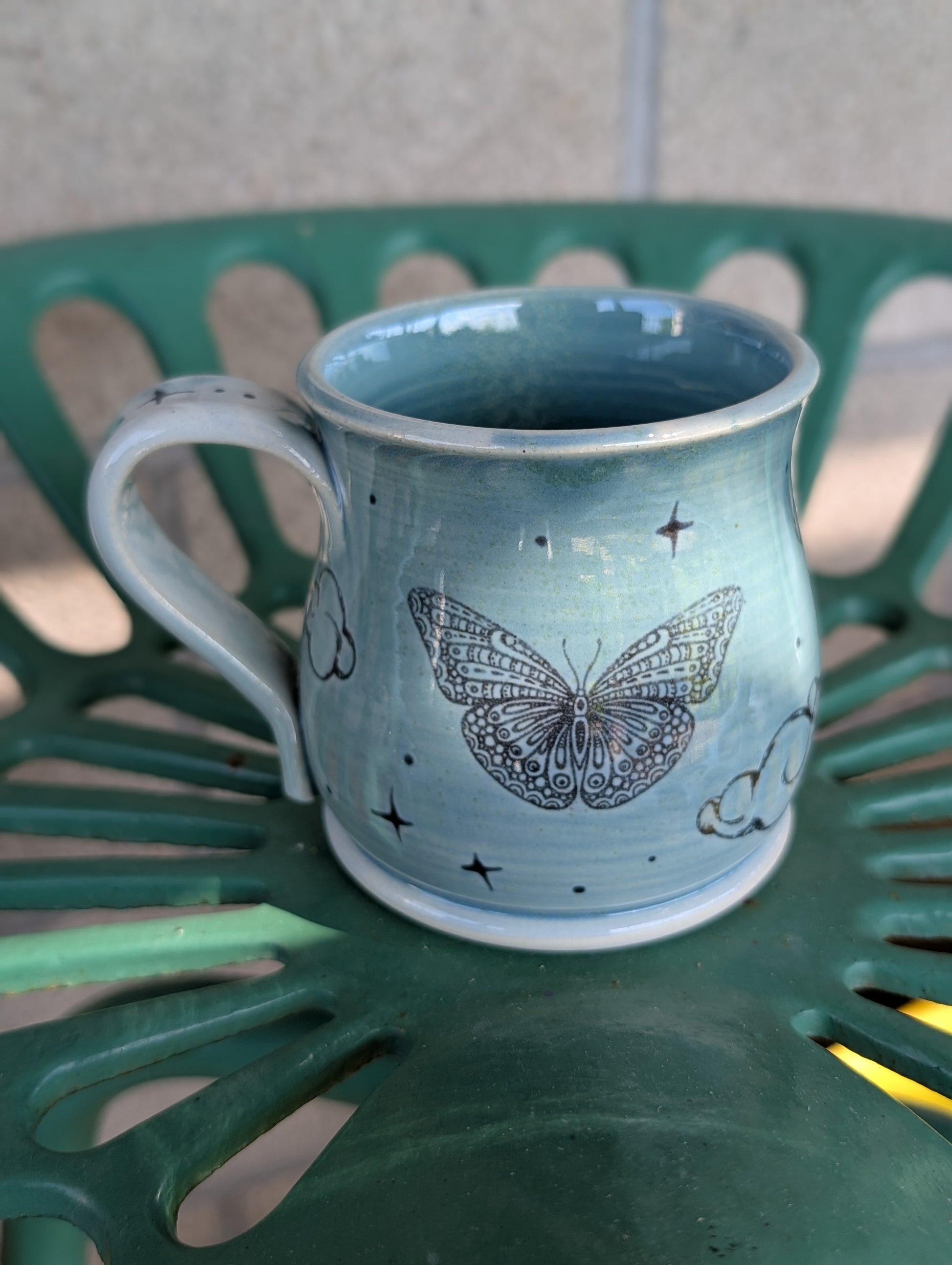 Features: Hand-thrown & Home-grown stoneware, white clay body, glossy aqua glaze, buttery and cloud transfer, hand drawn sparkles. Each mug is hand stamped and hand signed ✍️